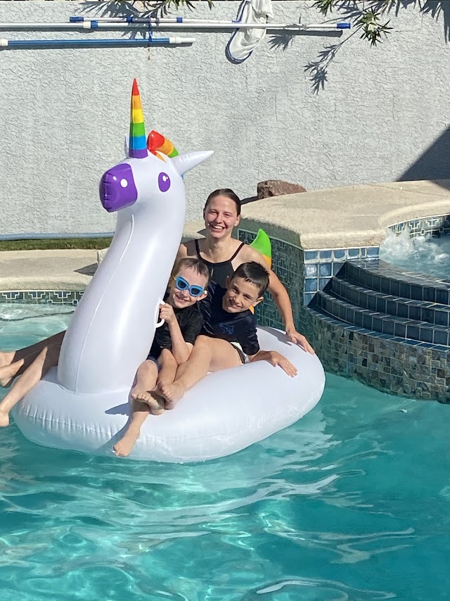 All the females in the group wanted to hold the baby—the most smiley 4-month-old in the world. She brought joy to anyone who needed a little. The two almost-3-year-olds became sweet buddies, and the big boys enjoyed hanging out with my big “kids,” mostly in the pool with a giant unicorn.